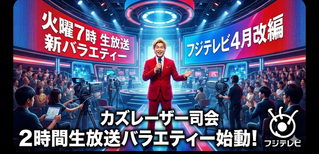 フジテレビは2026年4月の番組改編において、火曜午後7時のゴールデン帯に、メイプル超合金のカズレーザーさんをMCに迎えた2時間の生放送バラエティー番組を新設することを発表しました。録画視聴や配信が主流となる現代において、あえて「生」にこだわるフジテレビの真意とはどこにあるのでしょうか。
