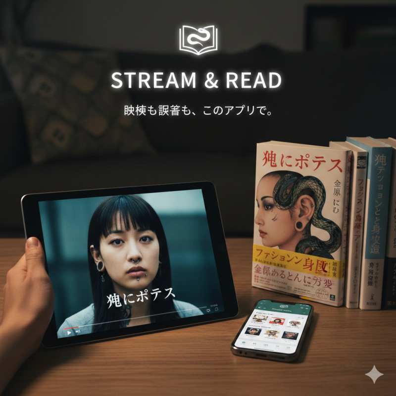 デバイスで映画『蛇にピアス』を視聴しながら、関連書籍もチェックできる動画配信サービスのイメージ