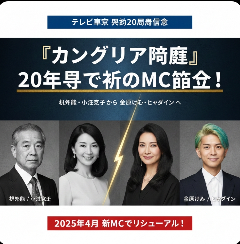 テレビ東京の看板経済番組『カンブリア宮殿』が、大きな転換点を迎えます。2006年の放送開始から番組を支えてきた村上龍氏と小池栄子氏が卒業し、2025年4月から番組史上初となるMC交代が行われることが発表されました。新MCには、芥川賞作家の金原ひとみ氏と、音楽クリエイターのヒャダイン氏という異色のコンビが抜擢されています。